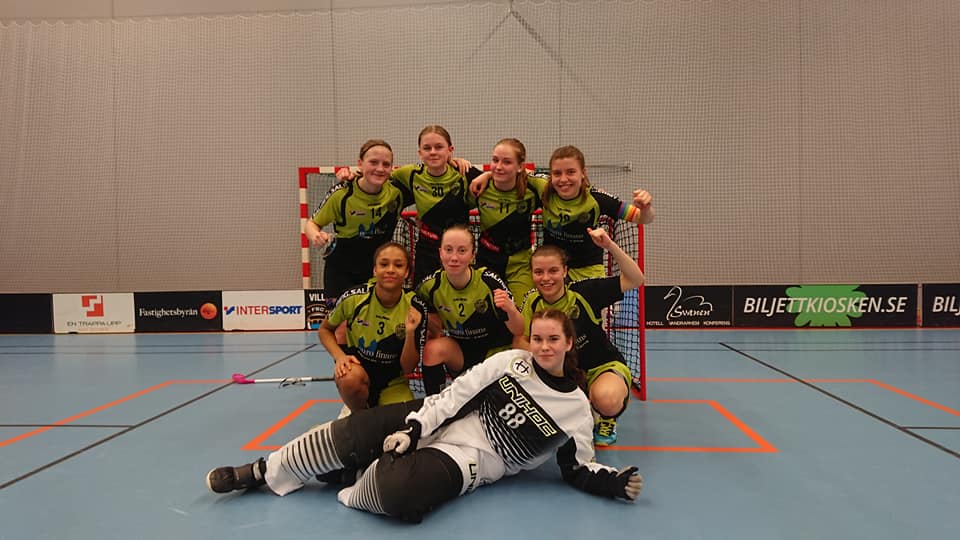 Och som de spelade! Vi visste om att tjejerna är bra men att de är så här bra visste vi inte. Spelet var så säkert där vi höll bollen och spelade runt trots att vi bara hade 2 avbytare att det nästan kändes säkert redan efter 2 minuters speltid när Emma växlade tempo gick coast to coast och satte 0-1. Vi gick fram till en säker 0-4 ledning efter fantastiska mål av Minna och Filippa, när 09.19 in i 2:a perioden Tindra får en knätackling på låret vilket gör att hon inte kan spela mer. Så vi får spela halva matchen med 6 utespelare men vi har väldigt bra tränade tjejer som fortsätter att spela nästan lika bra. Alex visade sig ha bäst kondition av alla då hon aldrig bytte i 3:e perioden, och hon hade ändå ork att göra ett mål och inte ett enda misstag. Elsa Arph gjorde debut i målet med den äran och var mycket nära att hålla nollan efter att ha agerat som om hon alltid spelat i Jas. Det gick ett sus genom publiken och vi hörde vilket klassmål när vi avslutade målskyttet för dagen med skott från Chanel och volleyretur av Filippa. Både innan och även efter att Tindra skadade sig visade hon sina ledaregenskaper. Tyra var lysande som back och visade ett stort spel med en extra bra känsla i klubbladet för dagen. Pål Karlsson hjälpte till med coachingen och fick tjejerna att bli avslappnade och peppade på samma gång. Vår 5 man starka hejaklack överröstade klart Kalmarsunds. Ja, man vill verkligen berömma alla och detta var så bra spel och så roligt att även om det kanske låter lite knasigt, att det blir något att minnas länge.
