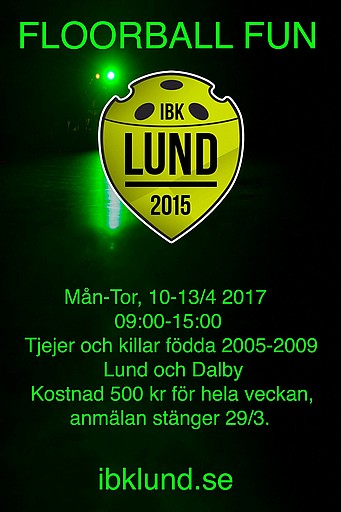 Det finns fortfarande platser kvar till en rolig innebandyvecka med FloorballFun på Påsklovet. Anmälan stänger den 29/3, så passa på att anmäl ert barn redan nu för att säkra er en plats. Det går naturligtvis bra att enbart anmäla sig till enstaka dagar, se mer information gällande detta på FloorballFun-sidan på ibklund.se!