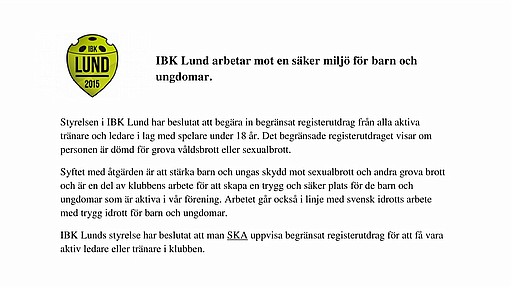 IBK Lunds styrelse har beslutat att man SKA uppvisa begränsat registerutdrag för att få vara aktiv ledare eller tränare i klubben.