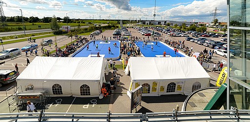 Första träffen med laget efter sommarlovet sker utanför ingången till köpcentret Nova Lund. Där har vi satt ihop en arena med två planer. I det förväntade solskenet spelas innebandy, 3 mot 3 med målvakt, på planer som mäter 20×10 meter. Mellan matcherna kan man shoppa, äta mat eller helt enkelt titta på alla andra matcher som spelas.