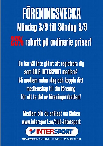 Under nästa vecka (v.36) mellan den 3/9 och 9/9 är det föreningsvecka på Intersport Nova Lund för alla IBK Lunds medlemmar. Intersport erbjuder under denna vecka 25% rabatt på ordinarie priser. Kanske hög tid att handla lite inför kommande innebandysäsong eller att hitta rätt kläder inför hösten? Då har Intersport det ni behöver.