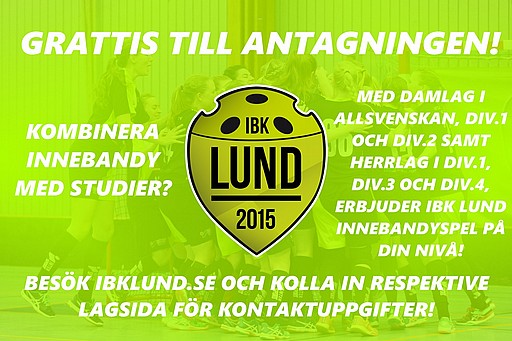 IBK Lund vill gratulera alla blivande studenter som i tisdags har blivit antagna till universitetsstudier under vårterminen 2019. En fantastisk tid i era liv som kommer fyllas med glädje och nya bekantskaper, något ni kommer minnas för evigt. Under studietiden är det viktigt med en god balans mellan studentliv, med allt vad det innebär, och motion. Detta får ni bäst med oss i IBK Lund. Som Skånes största innebandyförening kan vi erbjuda innebandyspel på flera nivåer för att matcha din ambitionsnivå. Vi har damlag i Allsvenskan, Div.1 och Div.2, samt herrlag i Div.1, Div.3 och Div.4. Till detta har vi även motionsgrupper som tränar olika dagar på olika platser i Lunds Kommun.